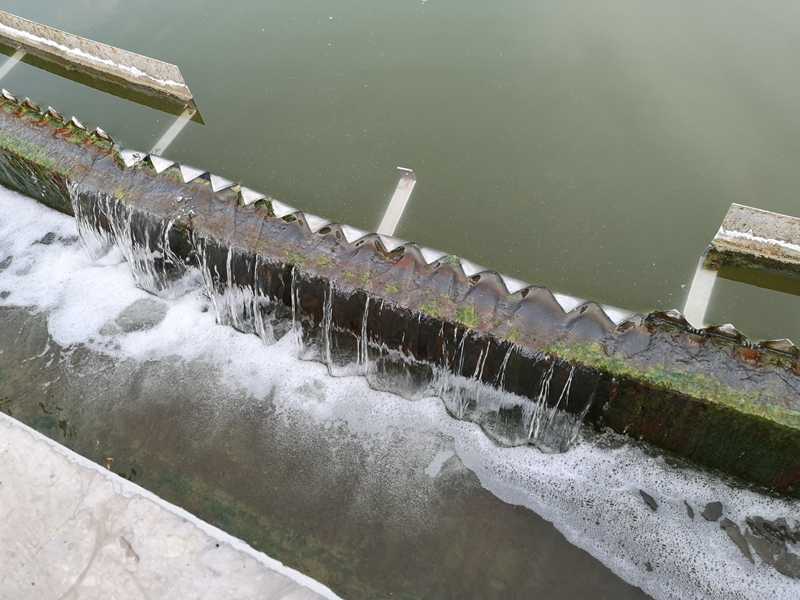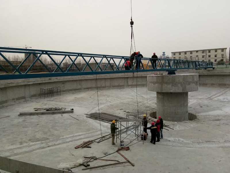 吸泥口,輸泥槽、虹吸管、中心泥罐、中心排泥管排至污泥坑。每個吸泥管上端設有調(diào)節(jié)器,以調(diào)節(jié)各吸泥管的流量分配。同時,液面上的浮渣向隨主梁旋轉(zhuǎn)的撇渣板和周邊浮渣擋板形成的漸縮區(qū)域內(nèi)集中,直至其封閉邊—刮渣擺臂。由擺臂上的刮渣板刮集至集渣斗排出池外。